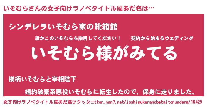 | 男性向けラノベタイトル風あだ名 | 『いそむらの嫁は女の子じゃないと思った?』 |