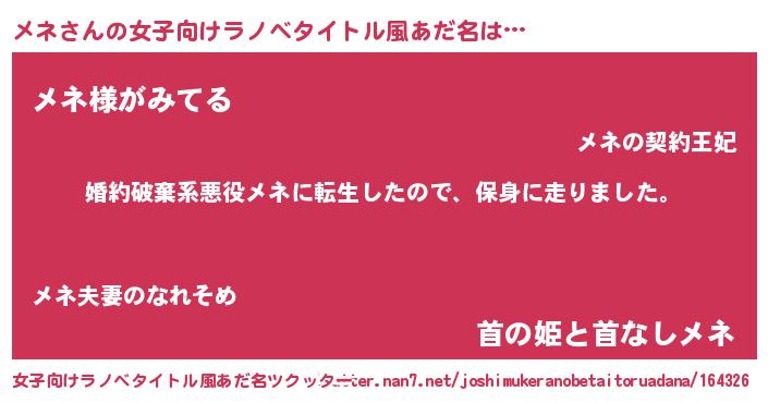 | 男性向けラノベタイトル風あだ名 | 『メネスレイヤー』『はたらくメネさま!』 |