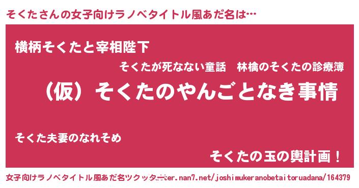 | 男性向けラノベタイトル風あだ名 | 『そくたの憂鬱』『魔弾の王とそくた』 |