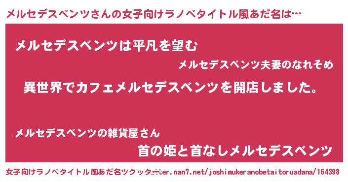 | 男性向けラノベタイトル風あだ名 | 『誰もが恐れるあのメルセデスベンツが、ぼくの専属メイドになるようです。』 |