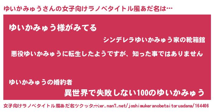 | 男性向けラノベタイトル風あだ名 | 『この素晴らしい世界にゆいかみゅうを!』 |