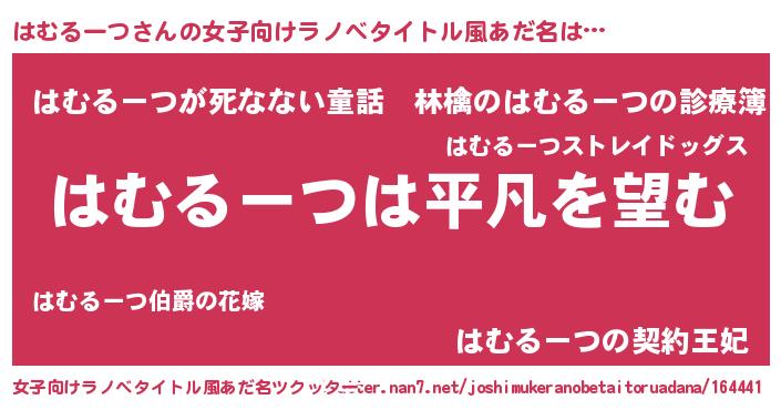 | 男性向けラノベタイトル風あだ名 | 『ダンジョンにはむるーつを求めるのは間違っているだろうか』 |