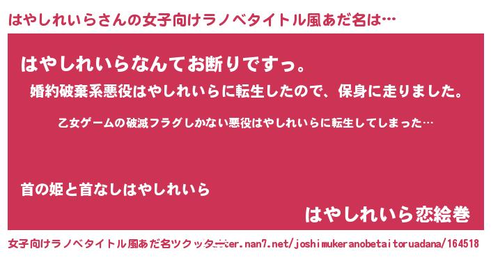 | 男性向けラノベタイトル風あだ名 | 『魔弾の王とはやしれいら』 |