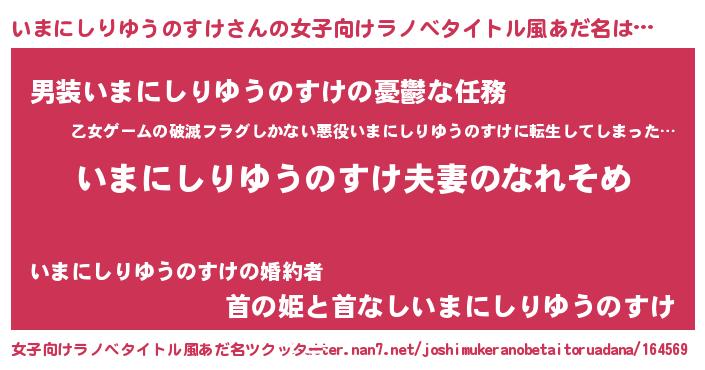 | 男性向けラノベタイトル風あだ名 | 『おまえをオタクにしてやるから、俺をいまにしりゆうのすけにしてくれ! 』 |