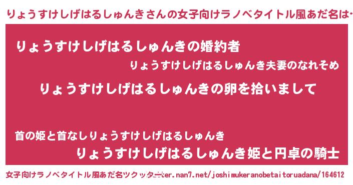 りょうすけしげはるしゅんきさんの女子向けラノベタイトル風あだ名は… 『りょうすけしげはるしゅんきの卵を拾いまして』『りょうすけしげはるしゅんきの婚約者』『りょうすけしげはるしゅんき姫と円卓の騎士』 ツクッター #女子向けラノベタイトル風あだ名ツクッター http://tkutter.nan7.net/joshimukeranobetaitoruadana/164612/