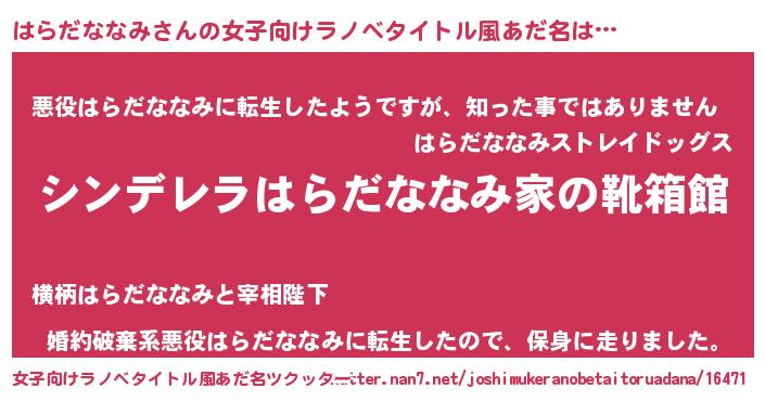 | 胡散臭い通販商品みたいなあだ名 | 『世界中を虜にした世界で10本だけ現存している希少なブランデー…その名も「はらだななみ」』 |