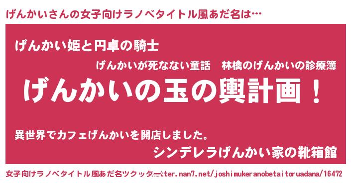 | 男性向けラノベタイトル風あだ名 | 『げんかい~年齢イコール彼女いない歴の魔法使い~』 |