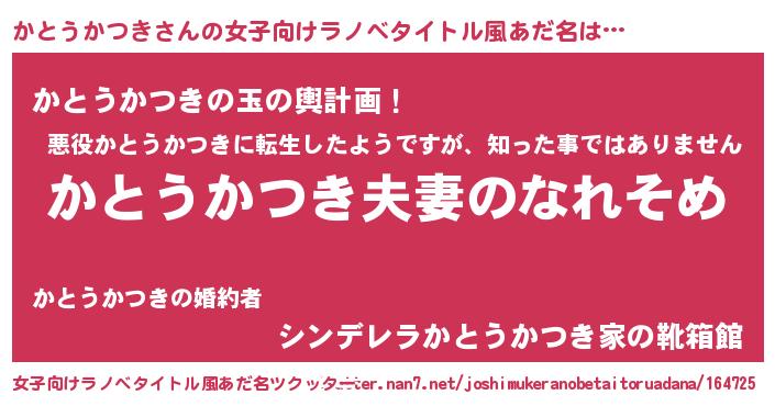 | 男性向けラノベタイトル風あだ名 | 『おまえをオタクにしてやるから、俺をかとうかつきにしてくれ! 』 |