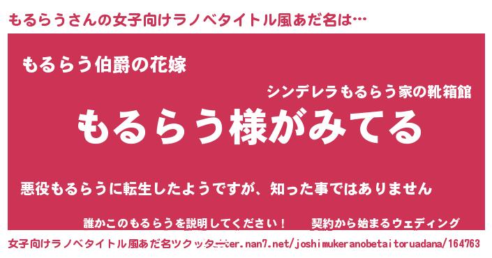 | 男性向けラノベタイトル風あだ名 | 『もるらうの嫁は女の子じゃないと思った?』 |