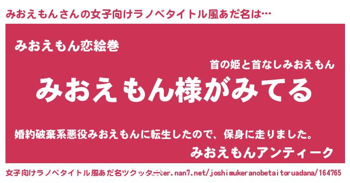 | 男性向けラノベタイトル風あだ名 | 『みおえもんの嫁は女の子じゃないと思った?』 |