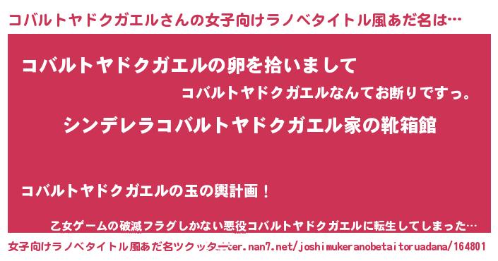 | 胡散臭い通販商品みたいなあだ名 | 『信頼と実績のサプリメント…その名も「コバルトヤドクガエル」』 |