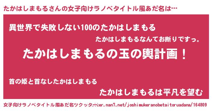 | 男性向けラノベタイトル風あだ名 | 『たかはしまもる~年齢イコール彼女いない歴の魔法使い~』 |