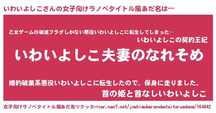 | 男性向けラノベタイトル風あだ名 | 『おまえをオタクにしてやるから、俺をいわいよしこにしてくれ! 』 |