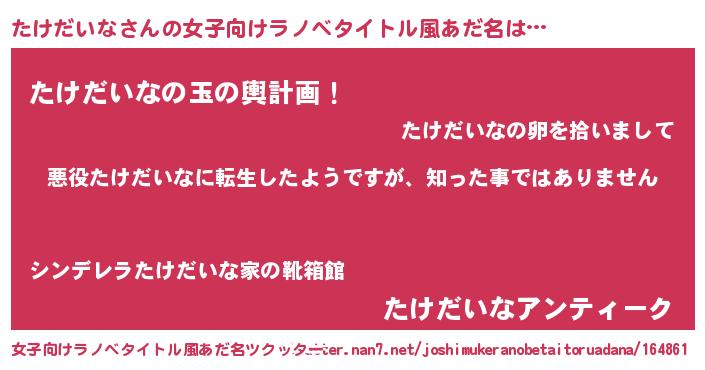 | 男性向けラノベタイトル風あだ名 | 『この素晴らしい世界にたけだいなを!』 |
