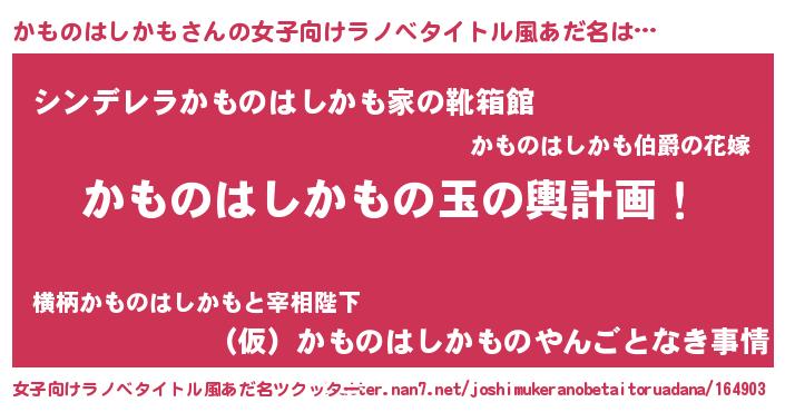 | 男性向けラノベタイトル風あだ名 | 『かものはしかも~年齢イコール彼女いない歴の魔法使い~』 |