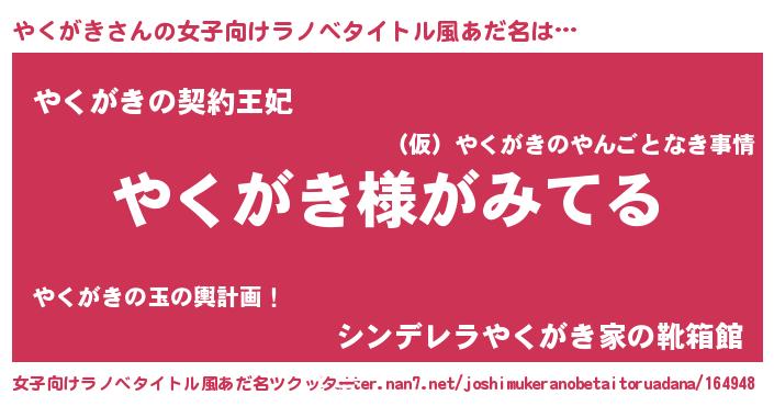 | 男性向けラノベタイトル風あだ名 | 『やくがきの嫁は女の子じゃないと思った?』 |