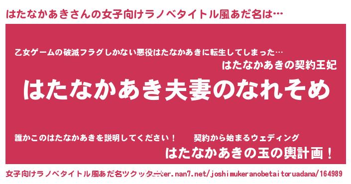 はたなかあきさんの女子向けラノベタイトル風あだ名は… 『はたなかあき夫妻のなれそめ』『乙女ゲームの破滅フラグしかない悪役はたなかあきに転生してしまった…』『はたなかあきの玉の輿計画!』 ツクッター #女子向けラノベタイトル風あだ名ツクッター http://tkutter.nan7.net/joshimukeranobetaitoruadana/164989/