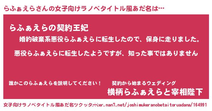 | 男性向けラノベタイトル風あだ名 | 『この素晴らしい世界にらふぁえらを!』 |