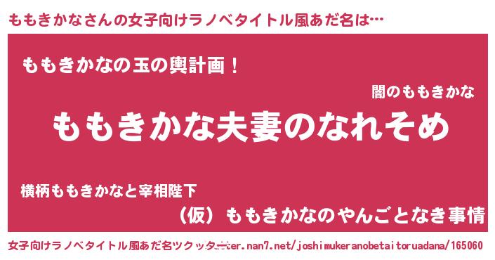 | 男性向けラノベタイトル風あだ名 | 『おまえをオタクにしてやるから、俺をももきかなにしてくれ! 』 |