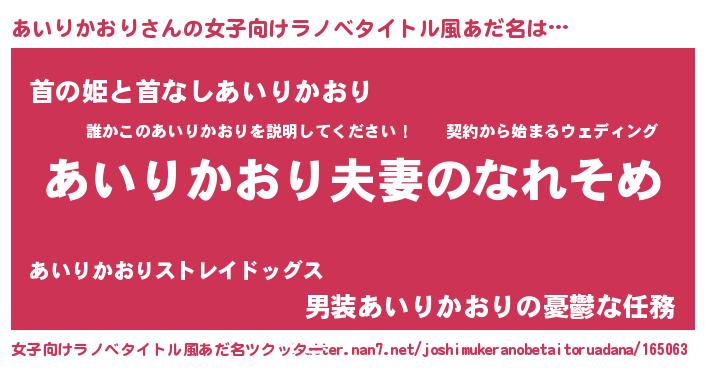 | 男性向けラノベタイトル風あだ名 | 『おまえをオタクにしてやるから、俺をあいりかおりにしてくれ! 』 |