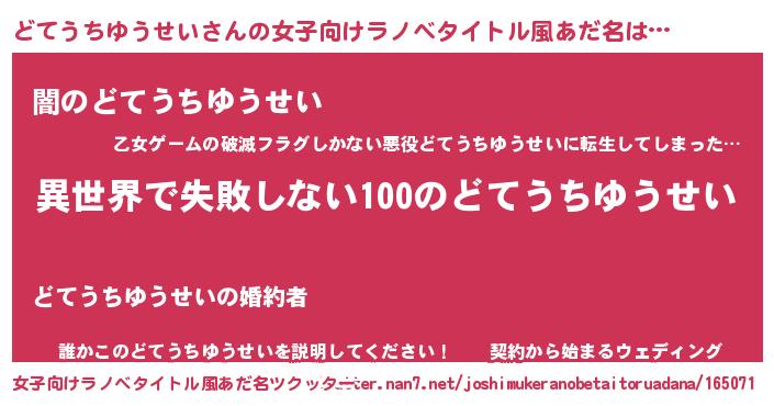 | 男性向けラノベタイトル風あだ名 | 『どてうちゆうせいという概念が存在しない退屈な世界 』 |