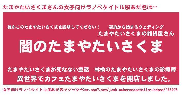 | 男性向けラノベタイトル風あだ名 | 『Re:たまやたいさくまから始める異世界生活』 |