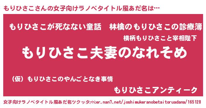 | 男性向けラノベタイトル風あだ名 | 『おまえをオタクにしてやるから、俺をもりひさこにしてくれ! 』 |