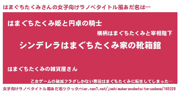 | 男性向けラノベタイトル風あだ名 | 『冴えないはまぐちたくみの育てかた』 |