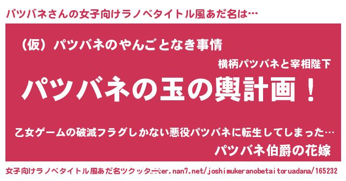| 男性向けラノベタイトル風あだ名 | 『パツバネ~年齢イコール彼女いない歴の魔法使い~』 |