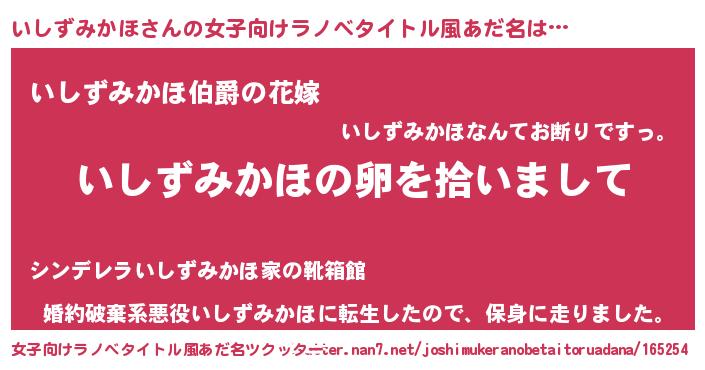 | 男性向けラノベタイトル風あだ名 | 『いしずみかほの嫁は女の子じゃないと思った?』 |