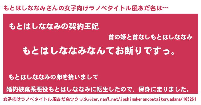 | 意味不明あだ名 | 『自称もとはしななみ』 |