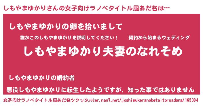 | 男性向けラノベタイトル風あだ名 | 『おまえをオタクにしてやるから、俺をしもやまゆかりにしてくれ! 』 |