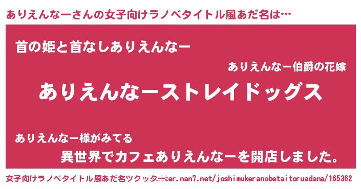 | 男性向けラノベタイトル風あだ名 | 『Re:ありえんなーから始める異世界生活』 |