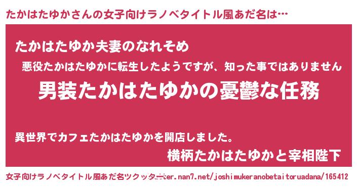 たかはたゆかさんの女子向けラノベタイトル風あだ名は… 『男装たかはたゆかの憂鬱な任務』『たかはたゆか夫妻のなれそめ』『横柄たかはたゆかと宰相陛下』 ツクッター #女子向けラノベタイトル風あだ名ツクッター http://tkutter.nan7.net/joshimukeranobetaitoruadana/165412/