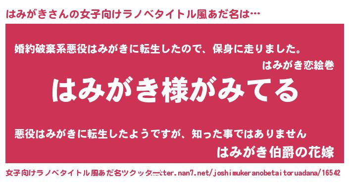 | 男性向けラノベタイトル風あだ名 | 『はみがきの嫁は女の子じゃないと思った?』 |