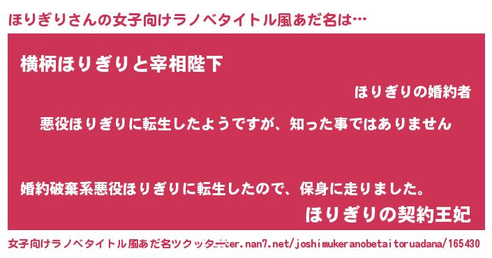 | 男性向けラノベタイトル風あだ名 | 『この素晴らしい世界にほりぎりを!』 |