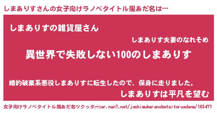 | 胡散臭い通販商品みたいなあだ名 | 『絶対に幸福をもたらす健康食品…その名も「しまありす」』 |