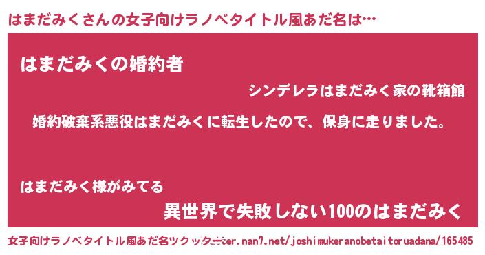 | 男性向けラノベタイトル風あだ名 | 『転生したらはまだみくだった件』 |