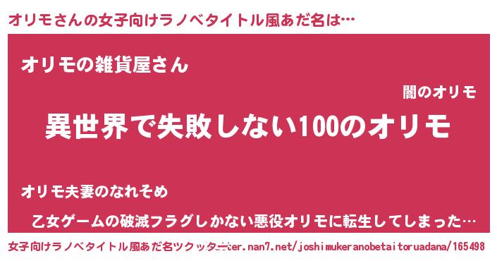 | 男性向けラノベタイトル風あだ名 | 『オリモという概念が存在しない退屈な世界 』 |