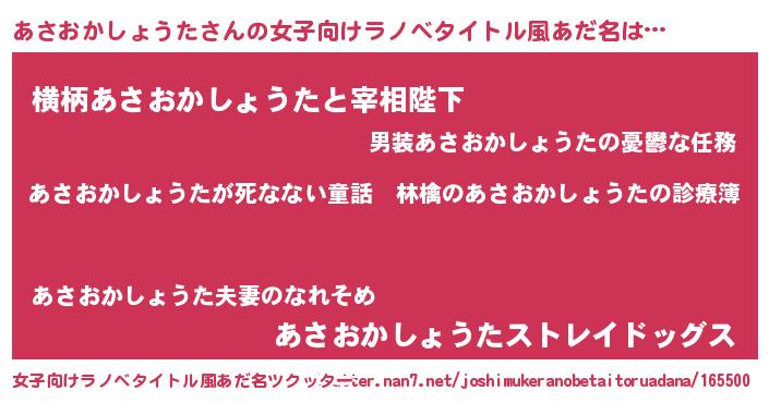 | 男性向けラノベタイトル風あだ名 | 『魔弾の王とあさおかしょうた』 |