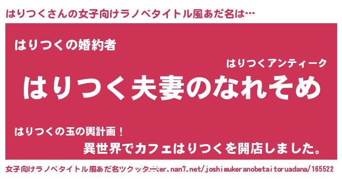 はりつくさんの女子向けラノベタイトル風あだ名は… 『はりつく夫妻のなれそめ』『はりつくの婚約者』『異世界でカフェはりつくを開店しました。』 ツクッター #女子向けラノベタイトル風あだ名ツクッター http://tkutter.nan7.net/joshimukeranobetaitoruadana/165522/