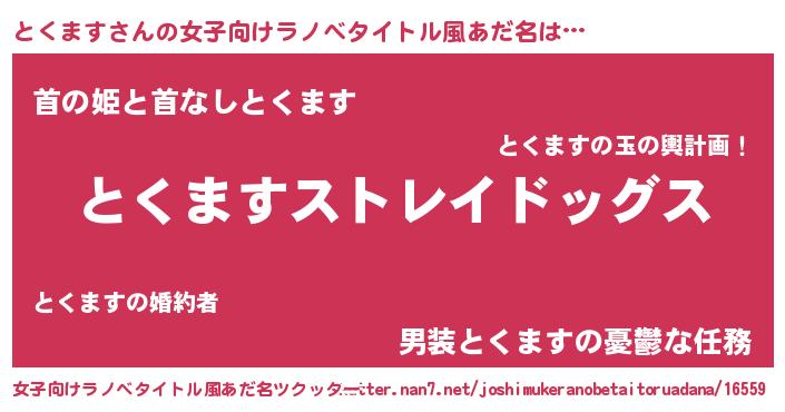 | 男性向けラノベタイトル風あだ名 | 『Re:とくますから始める異世界生活』 |