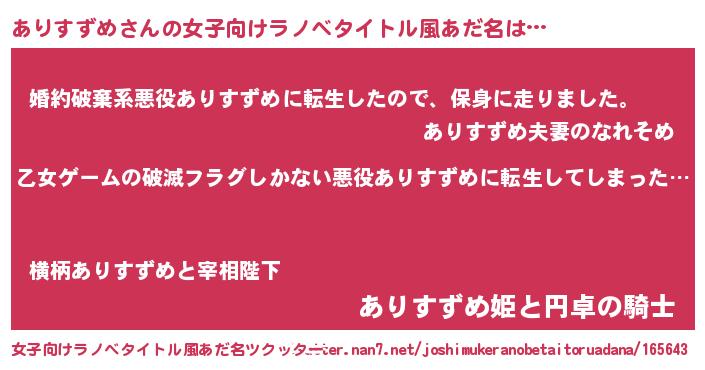 | 男性向けラノベタイトル風あだ名 | 『この素晴らしい世界にありすずめを!』 |