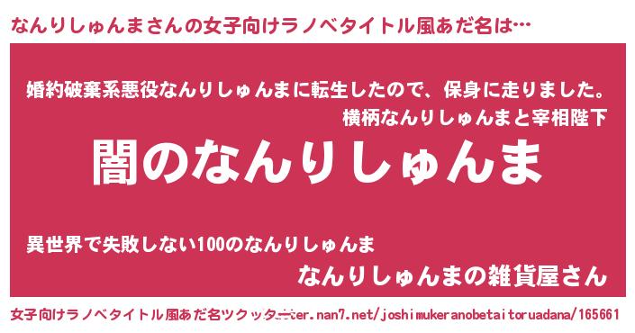 | 男性向けラノベタイトル風あだ名 | 『Re:なんりしゅんまから始める異世界生活』 |
