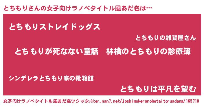 | 男性向けラノベタイトル風あだ名 | 『魔弾の王ととちもり』 |