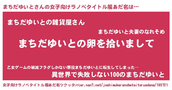 まちだゆいとさんの女子向けラノベタイトル風あだ名は… 『まちだゆいとの卵を拾いまして』『まちだゆいとの雑貨屋さん』『異世界で失敗しない100のまちだゆいと』 ツクッター #女子向けラノベタイトル風あだ名ツクッター http://tkutter.nan7.net/joshimukeranobetaitoruadana/165721/