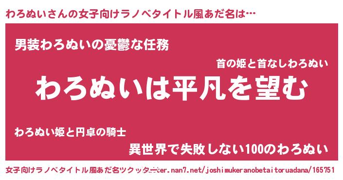 わろぬいさんの女子向けラノベタイトル風あだ名は… 『わろぬいは平凡を望む』『男装わろぬいの憂鬱な任務』『異世界で失敗しない100のわろぬい』 ツクッター #女子向けラノベタイトル風あだ名ツクッター http://tkutter.nan7.net/joshimukeranobetaitoruadana/165751/