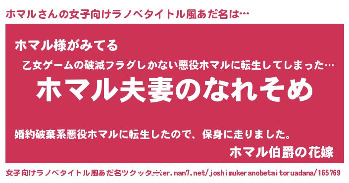 | 男性向けラノベタイトル風あだ名 | 『おまえをオタクにしてやるから、俺をホマルにしてくれ! 』 |