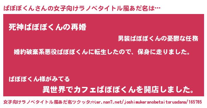 ばぼぼくんさんの女子向けラノベタイトル風あだ名は… 『婚約破棄系悪役ばぼぼくんに転生したので、保身に走りました。』『死神ばぼぼくんの再婚』『異世界でカフェばぼぼくんを開店しました。』 ツクッター #女子向けラノベタイトル風あだ名ツクッター http://tkutter.nan7.net/joshimukeranobetaitoruadana/165785/