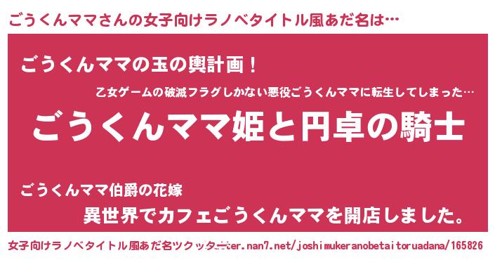 | 男性向けラノベタイトル風あだ名 | 『ゴウクンママアートオンライン』 |